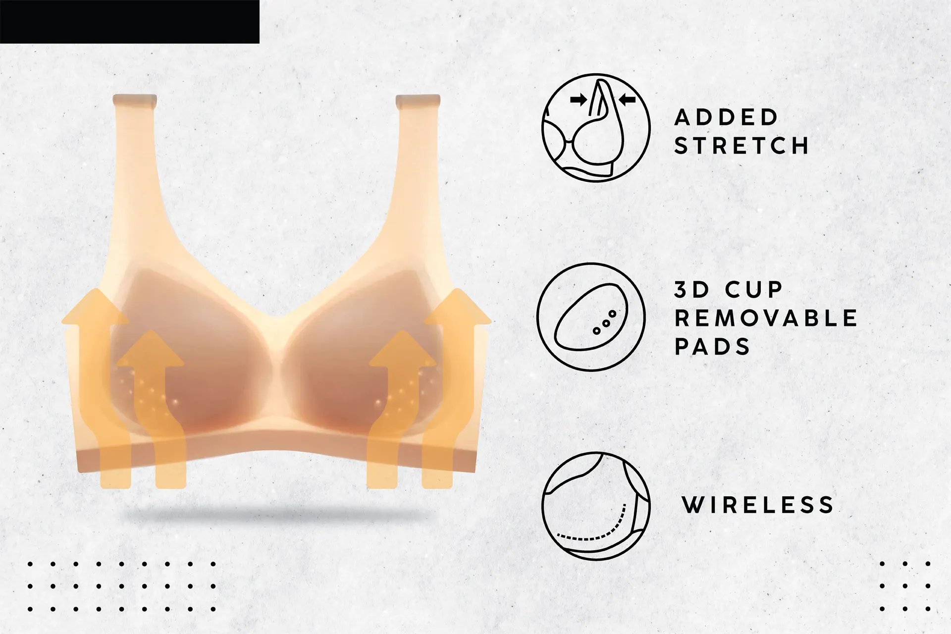 LIFT & SUPPORTS CHEST: a bra without braces and natural pads that provide a cozy and firmer support.